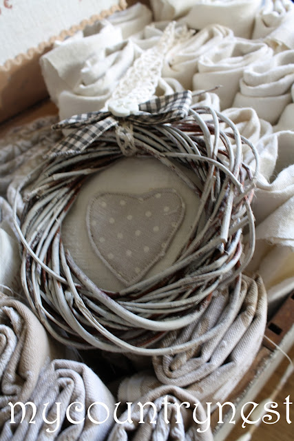 Non so più se l'avevo mostrata ma questa piccola piccola ghirlanda l'ho sbiancata e le ho aggiunto un fondo di tela vintage con un cuore applicato.